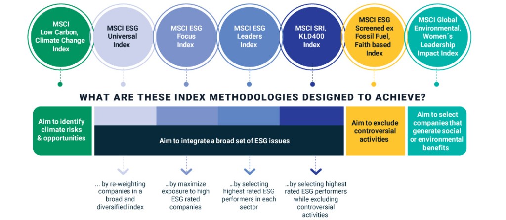 - Beyond these, MSCI offers a host of positive environmental indexes (Climate Paris Aligned, Climate Change, and Low Carbon), as well as, impact indexes (Global Environmental, Sustainable Impact and Women Leadership). All of these do a mix of negative screens and positive weighting or impact selection.