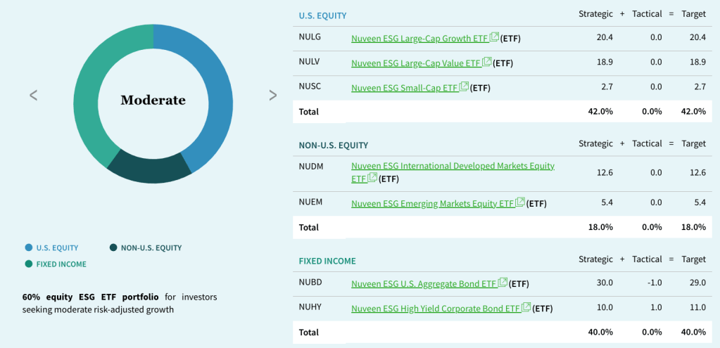 If you want to be maximally pro-ESG while still being in index funds and are willing to pay a price for it, I recommend Nuveen’s funds. They were rated ‘Advanced’ by Morningstar due to their ESG index design, as well as, their long track record of pro-ESG proxy voting. You can use Nuveen’s tool to easily figure out how to build a well-balanced portfolio.