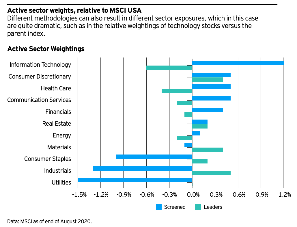 - Leaders and Select add conventional weapons, alcohol, nuclear power and gambling to their negative screens list. Leaders then positively screens for just the top 50% of ESG companies in each sector, while Select seeks to just reflect the underlying index.