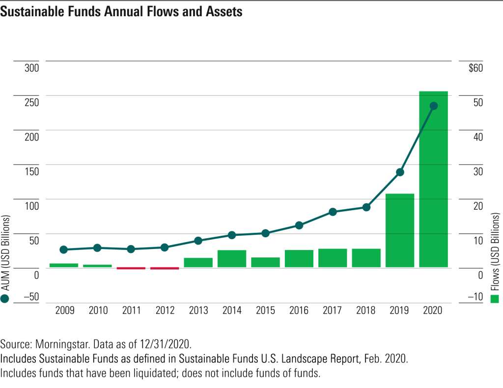 Even more exciting, while 62% of sustainable funds in the US are still invested in actively managed funds, in 2020, passive index funds attracted 70% of all sustainable capital inflows – driven largely by iShares launching a whole suite of ESG index funds in October 2020 that are both more rigorous and cheaper than other ESG index funds available on the market.